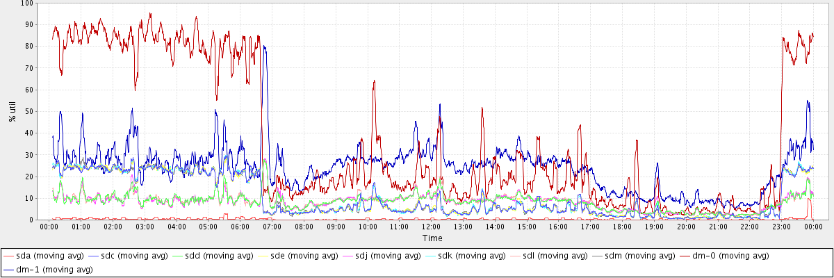 avg(sda) = 0.43 avg(sdc) = 10.13 avg(sdd) = 8.33 avg(sde) = 10.09 avg(sdj) = 8.32 avg(sdk) = 10.14 avg(sdl) = 8.41 avg(sdm) = 10.14 avg(dm-0) = 36.42 avg(dm-1) = 24.11