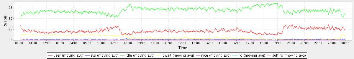 avg(user) = 21.71 avg(sys) = 1.84 avg(idle) = 69.12 avg(iowait) = 6.56 avg(nice) = 0.00 avg(irq) = 0.07 avg(softirq) = 0.70