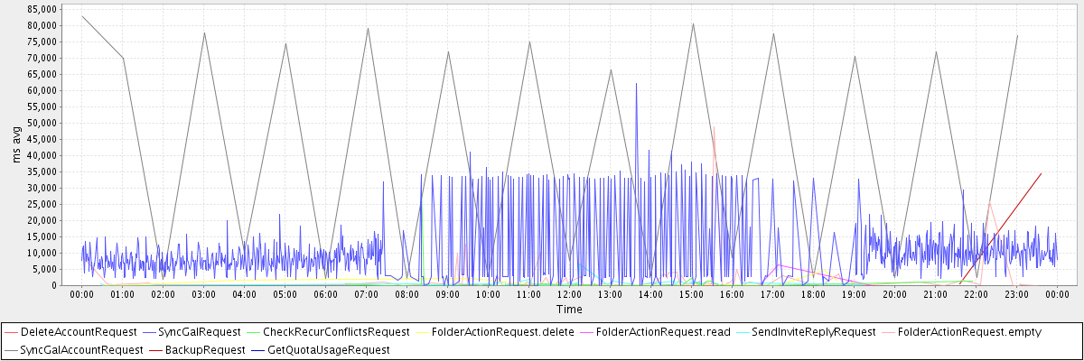 avg(DeleteAccountRequest) = 9622.00 avg(SyncGalRequest) = 10079.36 avg(CheckRecurConflictsRequest) = 859.71 avg(FolderActionRequest.delete) = 904.25 avg(FolderActionRequest.read) = 925.57 avg(SendInviteReplyRequest) = 762.30 avg(FolderActionRequest.empty) = 1958.39 avg(SyncGalAccountRequest) = 42540.38 avg(BackupRequest) = 17549.50 avg(GetQuotaUsageRequest) = 1405.00