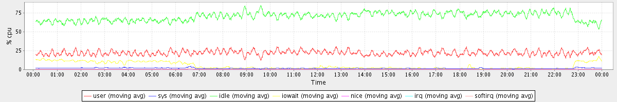 avg(user) = 22.17 avg(sys) = 1.67 avg(idle) = 70.57 avg(iowait) = 4.94 avg(nice) = 0.00 avg(irq) = 0.04 avg(softirq) = 0.61