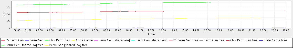 avg(PS Perm Gen) = 0.00 avg(Perm Gen) = 0.00 avg(CMS Perm Gen) = 88.64 avg(Code Cache) = 32.73 avg(Perm Gen [shared-ro]) = 0.00 avg(Perm Gen [shared-rw]) = 0.00 avg(PS Perm Gen free) = 0.00 avg(Perm Gen free) = 0.00 avg(CMS Perm Gen free) = 59.17 avg(Code Cache free) = 0.31 avg(Perm Gen [shared-ro] free) = 0.00 avg(Perm Gen [shared-rw] free) = 0.00