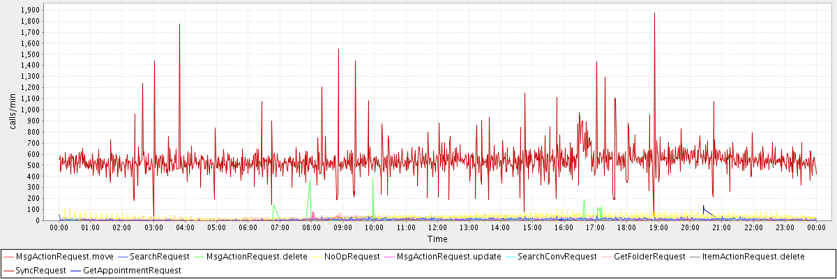 max(MsgActionRequest.move) = 80.00 max(SearchRequest) = 54.00 max(MsgActionRequest.delete) = 385.00 max(NoOpRequest) = 112.00 max(MsgActionRequest.update) = 74.00 max(SearchConvRequest) = 41.00 max(GetFolderRequest) = 74.00 max(ItemActionRequest.delete) = 40.00 max(SyncRequest) = 1871.00 max(GetAppointmentRequest) = 138.00
