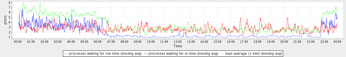 avg(processes waiting for run time) = 2.33 avg(processes waiting for io time) = 1.13 avg(load average (1 min)) = 3.60