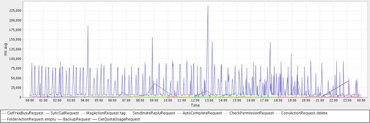 avg(GetFreeBusyRequest) = 501.88 avg(SyncGalRequest) = 19214.18 avg(MsgActionRequest.tag) = 642.80 avg(SendInviteReplyRequest) = 647.00 avg(AutoCompleteRequest) = 653.41 avg(CheckPermissionRequest) = 2100.40 avg(ConvActionRequest.delete) = 2073.40 avg(FolderActionRequest.empty) = 3645.90 avg(BackupRequest) = 21945.50 avg(GetQuotaUsageRequest) = 1280.00