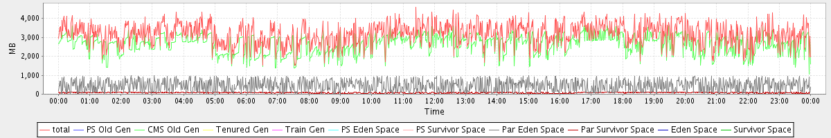avg(total) = 3177.23 avg(PS Old Gen) = 0.00 avg(CMS Old Gen) = 2649.59 avg(Tenured Gen) = 0.00 avg(Train Gen) = 0.00 avg(PS Eden Space) = 0.00 avg(PS Survivor Space) = 0.00 avg(Par Eden Space) = 456.26 avg(Par Survivor Space) = 71.38 avg(Eden Space) = 0.00 avg(Survivor Space) = 0.00