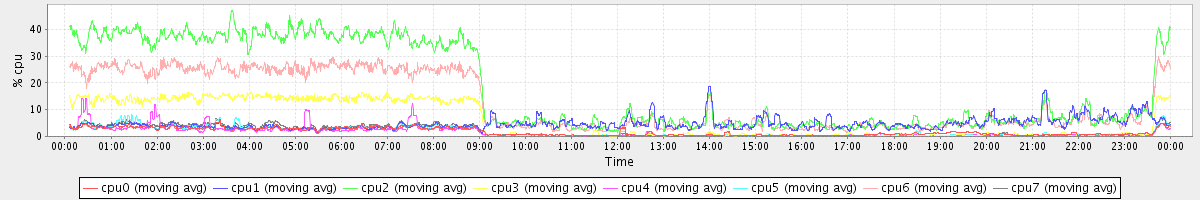 avg(cpu0) = 1.73 avg(cpu1) = 4.71 avg(cpu2) = 18.03 avg(cpu3) = 5.96 avg(cpu4) = 1.55 avg(cpu5) = 1.76 avg(cpu6) = 12.67 avg(cpu7) = 1.87
