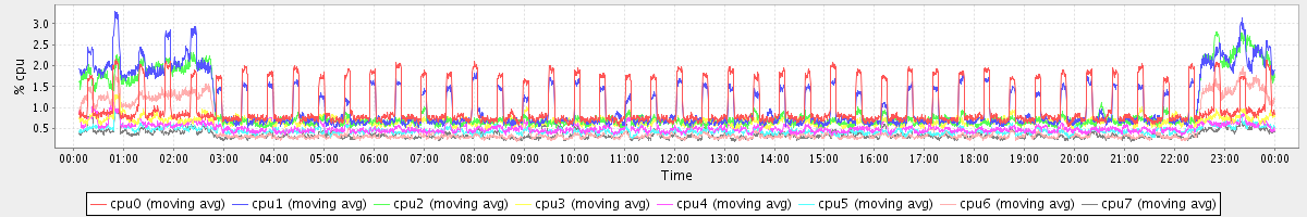 avg(cpu0) = 1.01 avg(cpu1) = 1.09 avg(cpu2) = 0.92 avg(cpu3) = 0.68 avg(cpu4) = 0.51 avg(cpu5) = 0.45 avg(cpu6) = 0.51 avg(cpu7) = 0.35