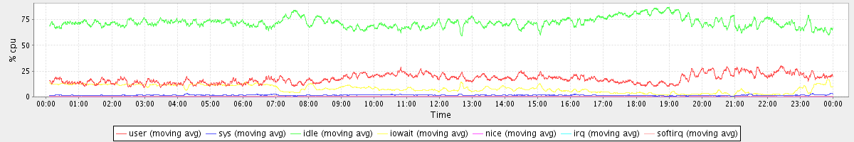 avg(user) = 17.71 avg(sys) = 1.60 avg(idle) = 72.35 avg(iowait) = 7.82 avg(nice) = 0.00 avg(irq) = 0.06 avg(softirq) = 0.48