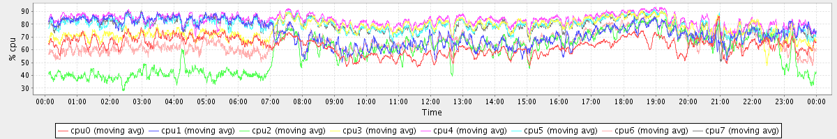 avg(cpu0) = 63.28 avg(cpu1) = 73.00 avg(cpu2) = 58.07 avg(cpu3) = 76.62 avg(cpu4) = 83.21 avg(cpu5) = 79.39 avg(cpu6) = 65.85 avg(cpu7) = 79.35