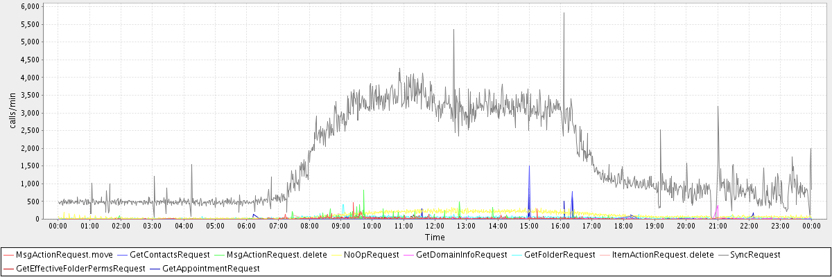max(MsgActionRequest.move) = 476.00 max(GetContactsRequest) = 1497.00 max(MsgActionRequest.delete) = 821.00 max(NoOpRequest) = 328.00 max(GetDomainInfoRequest) = 398.00 max(GetFolderRequest) = 416.00 max(ItemActionRequest.delete) = 160.00 max(SyncRequest) = 5819.00 max(GetEffectiveFolderPermsRequest) = 282.00 max(GetAppointmentRequest) = 852.00