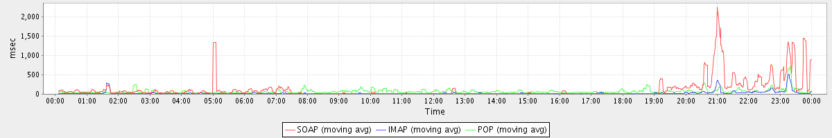 avg(FolderActionRequest.sync) = 7946.67 avg(GetContactsRequest) = 1370.75 avg(DeleteAccountRequest) = 4210.00 avg(SyncGalRequest) = 23504.28 avg(FolderActionRequest.delete) = 649.33 avg(AutoCompleteRequest) = 700.45 avg(ApplyFilterRulesRequest) = 7198.00 avg(ConvActionRequest.delete) = 687.71 avg(FolderActionRequest.empty) = 3481.20 avg(GetQuotaUsageRequest) = 1200.00
