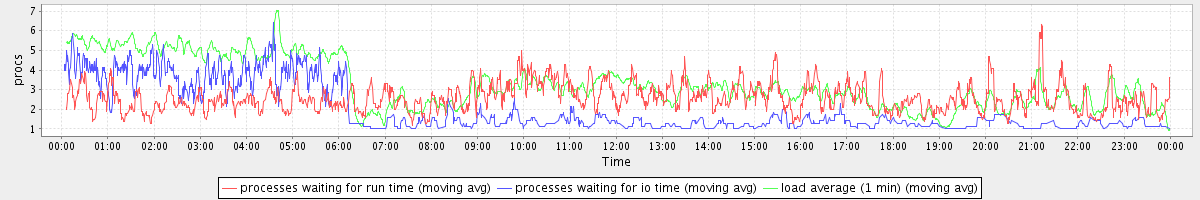 avg(processes waiting for run time) = 1.97 avg(processes waiting for io time) = 1.25 avg(load average (1 min)) = 3.26