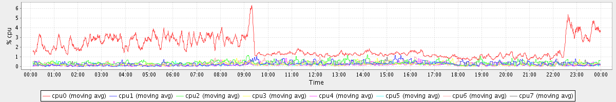 avg(cpu0) = 1.94 avg(cpu1) = 0.29 avg(cpu2) = 0.40 avg(cpu3) = 0.22 avg(cpu4) = 0.17 avg(cpu5) = 0.17 avg(cpu6) = 0.28 avg(cpu7) = 0.19