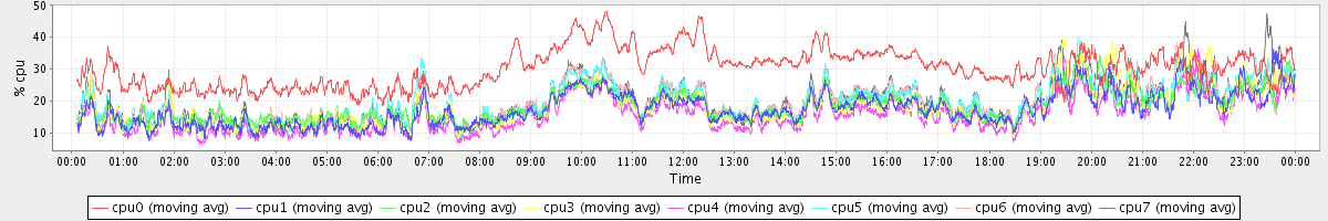 avg(cpu0) = 30.24 avg(cpu1) = 17.47 avg(cpu2) = 18.43 avg(cpu3) = 18.15 avg(cpu4) = 15.69 avg(cpu5) = 19.48 avg(cpu6) = 19.20 avg(cpu7) = 19.75