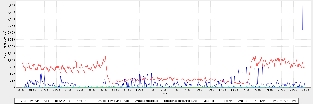 avg(slapd) = 531.53 avg(newsyslog) = 2850.00 avg(zmcontrol) = 4.76 avg(syslogd) = 16.28 avg(zmbackupldap) = 5.00 avg(puppetd) = 11.99 avg(slapcat) = 267.00 avg(tripwire) = 2283.00 avg(zm-ldap-checkre) = 5.10 avg(java) = 122.28