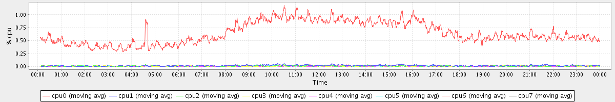 avg(cpu0) = 1.26 avg(cpu1) = 0.91 avg(cpu2) = 0.78 avg(cpu3) = 0.70 avg(cpu4) = 0.49 avg(cpu5) = 0.49 avg(cpu6) = 0.52 avg(cpu7) = 0.48