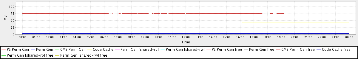avg(PS Perm Gen) = 0.00 avg(Perm Gen) = 0.00 avg(CMS Perm Gen) = 114.32 avg(Code Cache) = 44.34 avg(Perm Gen [shared-ro]) = 0.00 avg(Perm Gen [shared-rw]) = 0.00 avg(PS Perm Gen free) = 0.00 avg(Perm Gen free) = 0.00 avg(CMS Perm Gen free) = 76.36 avg(Code Cache free) = 3.54 avg(Perm Gen [shared-ro] free) = 0.00 avg(Perm Gen [shared-rw] free) = 0.00