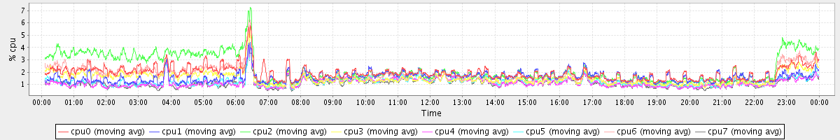 avg(cpu0) = 2.02 avg(cpu1) = 0.29 avg(cpu2) = 0.39 avg(cpu3) = 0.26 avg(cpu4) = 0.20 avg(cpu5) = 0.23 avg(cpu6) = 0.30 avg(cpu7) = 0.23
