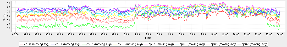 avg(cpu0) = 58.85 avg(cpu1) = 71.69 avg(cpu2) = 51.39 avg(cpu3) = 69.88 avg(cpu4) = 77.87 avg(cpu5) = 72.27 avg(cpu6) = 58.99 avg(cpu7) = 72.86