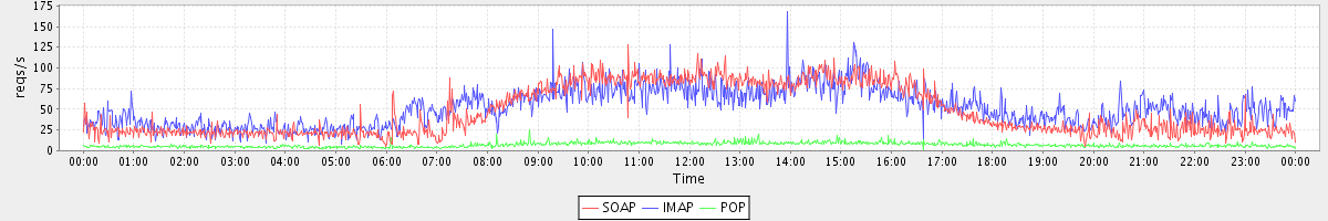 Host zm04.stanford.edu: Mailboxd: Request Rate by Client Protocol