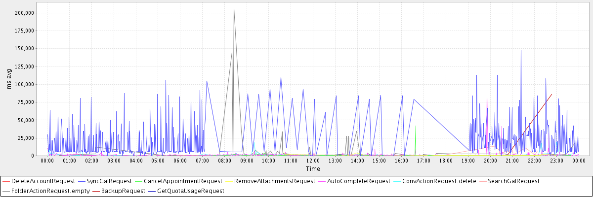 avg(DeleteAccountRequest) = 146421.00 avg(SyncGalRequest) = 19696.95 avg(CancelAppointmentRequest) = 757.44 avg(RemoveAttachmentsRequest) = 1276.00 avg(AutoCompleteRequest) = 1134.02 avg(ConvActionRequest.delete) = 1286.29 avg(SearchGalRequest) = 951.72 avg(FolderActionRequest.empty) = 8422.72 avg(BackupRequest) = 43487.50 avg(GetQuotaUsageRequest) = 1250.50