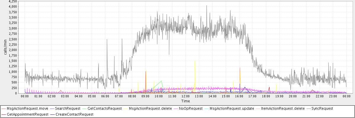 max(MsgActionRequest.move) = 1004.00 max(SearchRequest) = 442.00 max(GetContactsRequest) = 570.00 max(MsgActionRequest.delete) = 1507.00 max(NoOpRequest) = 321.00 max(MsgActionRequest.update) = 285.00 max(ItemActionRequest.delete) = 1194.00 max(SyncRequest) = 4051.00 max(GetAppointmentRequest) = 292.00 max(CreateContactRequest) = 283.00