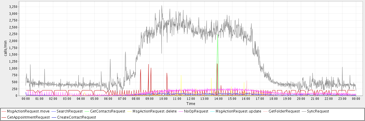 max(MsgActionRequest.move) = 158.00 max(SearchRequest) = 125.00 max(GetContactsRequest) = 2239.00 max(MsgActionRequest.delete) = 756.00 max(NoOpRequest) = 293.00 max(MsgActionRequest.update) = 124.00 max(GetFolderRequest) = 557.00 max(SyncRequest) = 3287.00 max(GetAppointmentRequest) = 1180.00 max(CreateContactRequest) = 166.00
