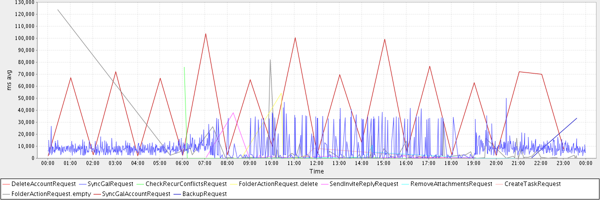 avg(DeleteAccountRequest) = 124125.00 avg(SyncGalRequest) = 8935.38 avg(CheckRecurConflictsRequest) = 1653.16 avg(FolderActionRequest.delete) = 6470.67 avg(SendInviteReplyRequest) = 1604.39 avg(RemoveAttachmentsRequest) = 1555.00 avg(CreateTaskRequest) = 2852.33 avg(FolderActionRequest.empty) = 4399.36 avg(SyncGalAccountRequest) = 41007.75 avg(BackupRequest) = 16801.00