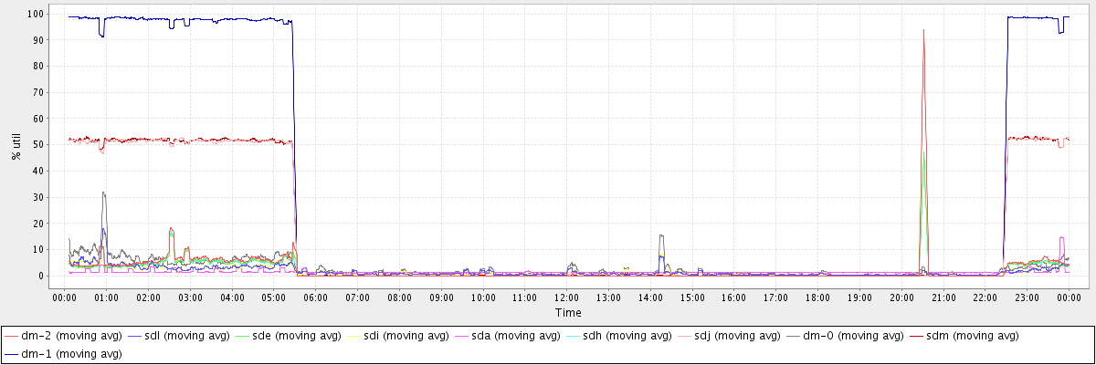 avg(dm-2) = 2.21 avg(sdl) = 1.54 avg(sde) = 1.75 avg(sdi) = 1.49 avg(sda) = 1.45 avg(sdh) = 1.74 avg(sdj) = 15.06 avg(dm-0) = 2.81 avg(sdm) = 15.14 avg(dm-1) = 28.60