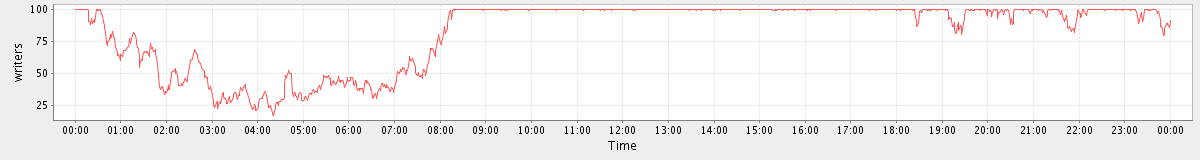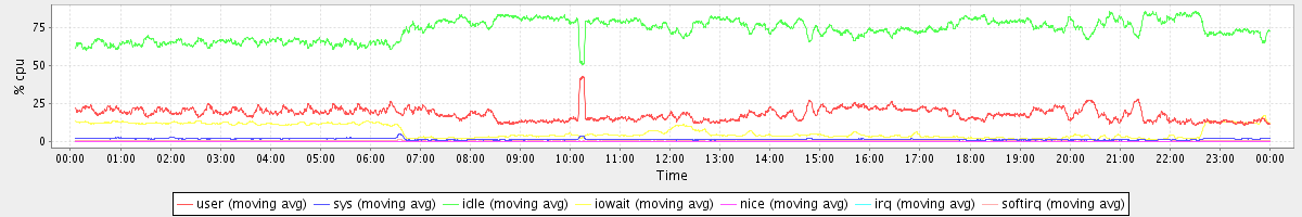 avg(user) = 18.09 avg(sys) = 1.48 avg(idle) = 73.50 avg(iowait) = 6.43 avg(nice) = 0.00 avg(irq) = 0.04 avg(softirq) = 0.46