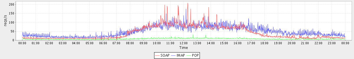 Host zm05.stanford.edu: Mailboxd: Request Rate by Client Protocol