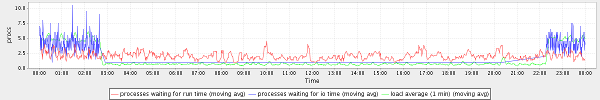 avg(processes waiting for run time) = 0.86 avg(processes waiting for io time) = 0.75 avg(load average (1 min)) = 1.45