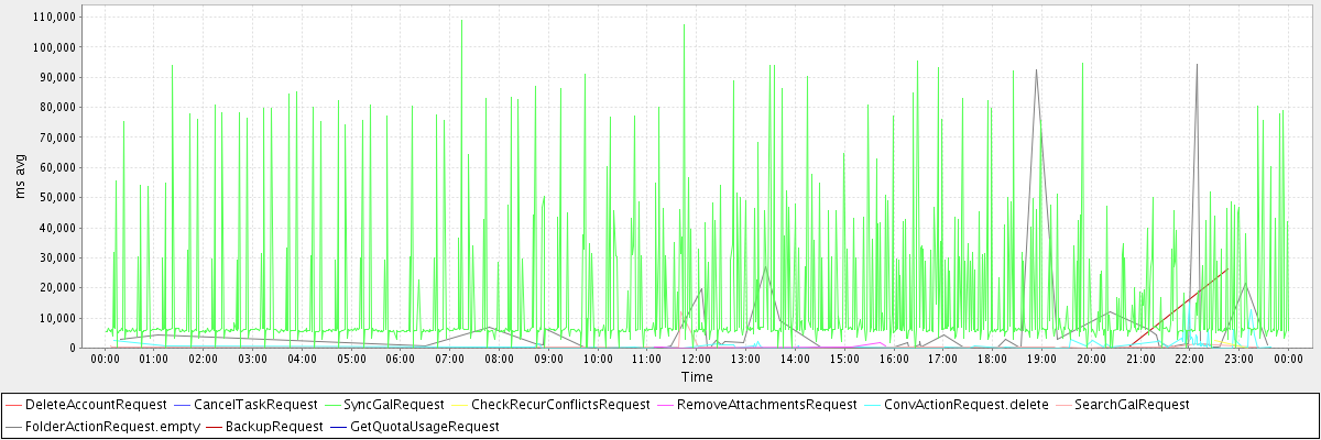 avg(DeleteAccountRequest) = 1799.00 avg(CancelTaskRequest) = 769.00 avg(SyncGalRequest) = 15099.64 avg(CheckRecurConflictsRequest) = 1303.50 avg(RemoveAttachmentsRequest) = 618.57 avg(ConvActionRequest.delete) = 1412.89 avg(SearchGalRequest) = 772.38 avg(FolderActionRequest.empty) = 5607.97 avg(BackupRequest) = 13411.00 avg(GetQuotaUsageRequest) = 1247.00