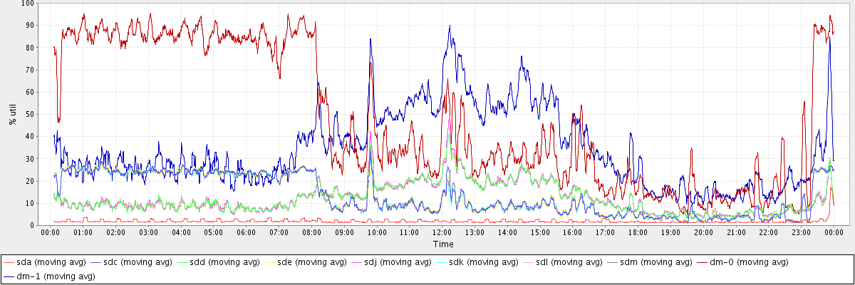 avg(sda) = 1.90 avg(sdc) = 13.46 avg(sdd) = 12.13 avg(sde) = 13.40 avg(sdj) = 12.15 avg(sdk) = 13.34 avg(sdl) = 12.19 avg(sdm) = 13.40 avg(dm-0) = 48.01 avg(dm-1) = 34.23