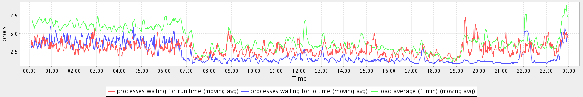 avg(processes waiting for run time) = 2.51 avg(processes waiting for io time) = 1.58 avg(load average (1 min)) = 4.25