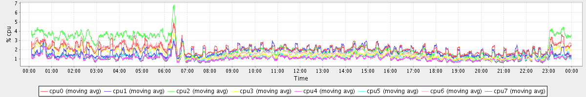 avg(cpu0) = 2.28 avg(cpu1) = 0.28 avg(cpu2) = 0.37 avg(cpu3) = 0.23 avg(cpu4) = 0.16 avg(cpu5) = 0.21 avg(cpu6) = 0.29 avg(cpu7) = 0.19