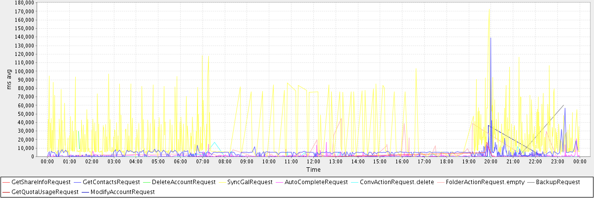 avg(GetShareInfoRequest) = 3585.17 avg(GetContactsRequest) = 3379.13 avg(DeleteAccountRequest) = 19397.00 avg(SyncGalRequest) = 22055.85 avg(AutoCompleteRequest) = 861.67 avg(ConvActionRequest.delete) = 908.29 avg(FolderActionRequest.empty) = 4236.05 avg(BackupRequest) = 30564.50 avg(GetQuotaUsageRequest) = 1276.00 avg(ModifyAccountRequest) = 2623.29