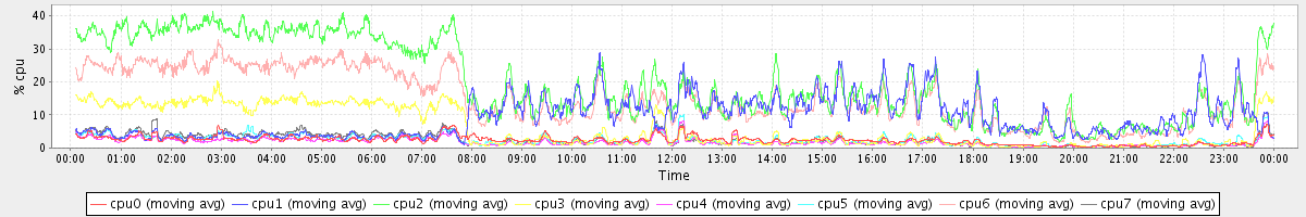 avg(cpu0) = 34.22 avg(cpu1) = 21.81 avg(cpu2) = 21.88 avg(cpu3) = 21.39 avg(cpu4) = 20.20 avg(cpu5) = 22.72 avg(cpu6) = 22.76 avg(cpu7) = 23.92