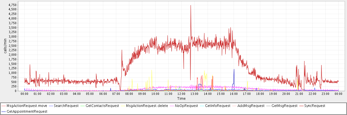 max(MsgActionRequest.move) = 876.00 max(SearchRequest) = 175.00 max(GetContactsRequest) = 233.00 max(MsgActionRequest.delete) = 1156.00 max(NoOpRequest) = 343.00 max(GetInfoRequest) = 162.00 max(AddMsgRequest) = 274.00 max(GetMsgRequest) = 205.00 max(SyncRequest) = 4721.00 max(GetAppointmentRequest) = 1213.00