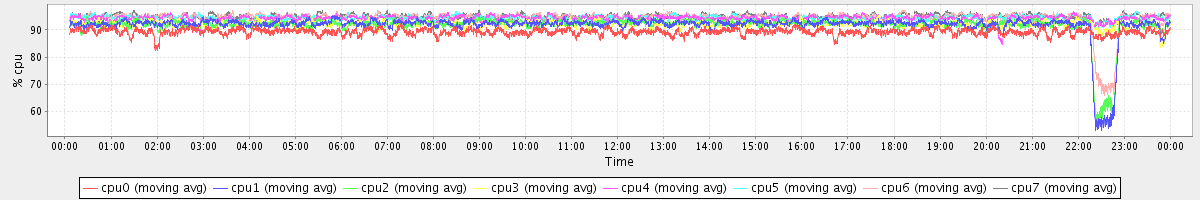 avg(cpu0) = 89.29 avg(cpu1) = 91.58 avg(cpu2) = 91.66 avg(cpu3) = 92.16 avg(cpu4) = 94.23 avg(cpu5) = 94.36 avg(cpu6) = 94.33 avg(cpu7) = 94.89