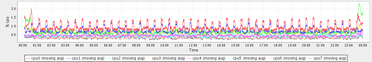 avg(cpu0) = 0.25 avg(cpu1) = 0.04 avg(cpu2) = 1.88 avg(cpu3) = 0.47 avg(cpu4) = 0.26 avg(cpu5) = 0.07 avg(cpu6) = 0.88 avg(cpu7) = 0.07