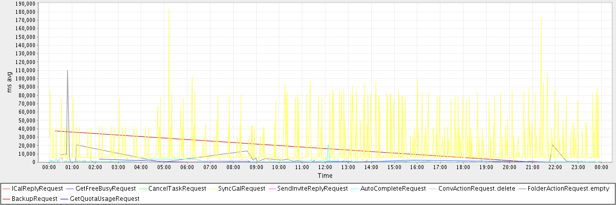 avg(ICalReplyRequest) = 2427.00 avg(GetFreeBusyRequest) = 642.87 avg(CancelTaskRequest) = 1293.33 avg(SyncGalRequest) = 17759.26 avg(SendInviteReplyRequest) = 1145.00 avg(AutoCompleteRequest) = 609.61 avg(ConvActionRequest.delete) = 629.93 avg(FolderActionRequest.empty) = 5038.94 avg(BackupRequest) = 18954.50 avg(GetQuotaUsageRequest) = 1144.00