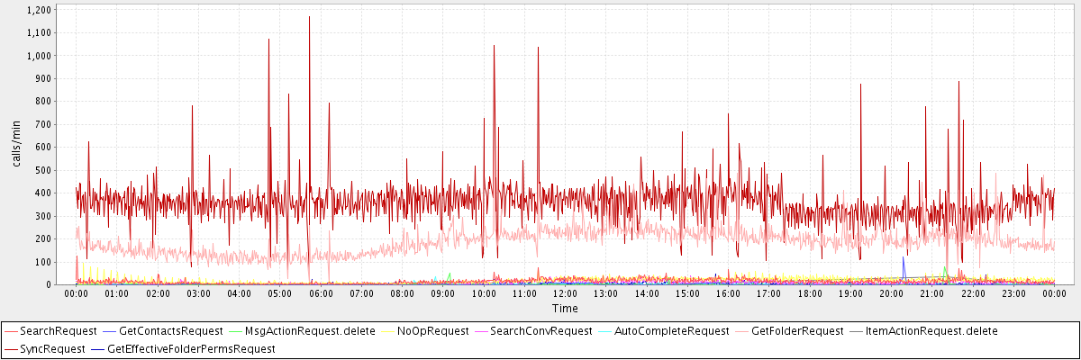 max(SearchRequest) = 127.00 max(GetContactsRequest) = 123.00 max(MsgActionRequest.delete) = 78.00 max(NoOpRequest) = 93.00 max(SearchConvRequest) = 39.00 max(AutoCompleteRequest) = 35.00 max(GetFolderRequest) = 584.00 max(ItemActionRequest.delete) = 34.00 max(SyncRequest) = 1169.00 max(GetEffectiveFolderPermsRequest) = 46.00