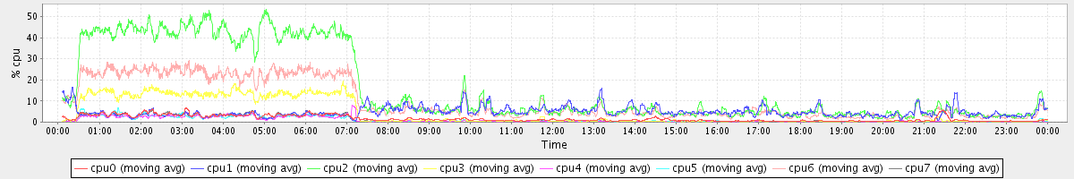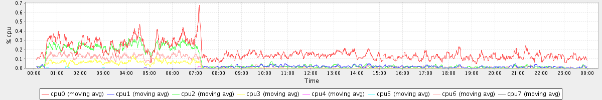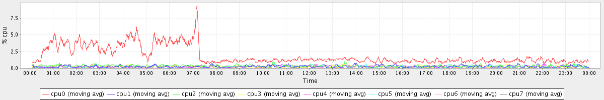 avg(cpu0) = 1.85 avg(cpu1) = 0.26 avg(cpu2) = 0.31 avg(cpu3) = 0.22 avg(cpu4) = 0.18 avg(cpu5) = 0.20 avg(cpu6) = 0.24 avg(cpu7) = 0.19