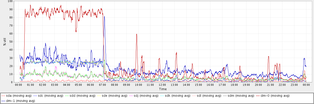 avg(sda) = 1.52 avg(sdc) = 8.38 avg(sdd) = 5.77 avg(sde) = 8.34 avg(sdj) = 5.83 avg(sdk) = 8.35 avg(sdl) = 5.83 avg(sdm) = 8.37 avg(dm-0) = 29.56 avg(dm-1) = 16.96