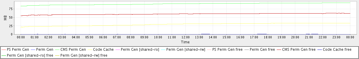 avg(PS Perm Gen) = 0.00 avg(Perm Gen) = 0.00 avg(CMS Perm Gen) = 90.11 avg(Code Cache) = 29.49 avg(Perm Gen [shared-ro]) = 0.00 avg(Perm Gen [shared-rw]) = 0.00 avg(PS Perm Gen free) = 0.00 avg(Perm Gen free) = 0.00 avg(CMS Perm Gen free) = 60.12 avg(Code Cache free) = 0.30 avg(Perm Gen [shared-ro] free) = 0.00 avg(Perm Gen [shared-rw] free) = 0.00