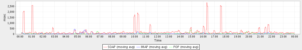 avg(GetContactsRequest) = 3414.25 avg(DeleteAccountRequest) = 7871.00 avg(GetFreeBusyRequest) = 3824.75 avg(SyncGalRequest) = 17776.06 avg(CheckRecurConflictsRequest) = 1180.00 avg(AutoCompleteRequest) = 530.48 avg(ConvActionRequest.delete) = 520.00 avg(FolderActionRequest.empty) = 2475.07 avg(BackupRequest) = 17857.50 avg(GetQuotaUsageRequest) = 1143.00