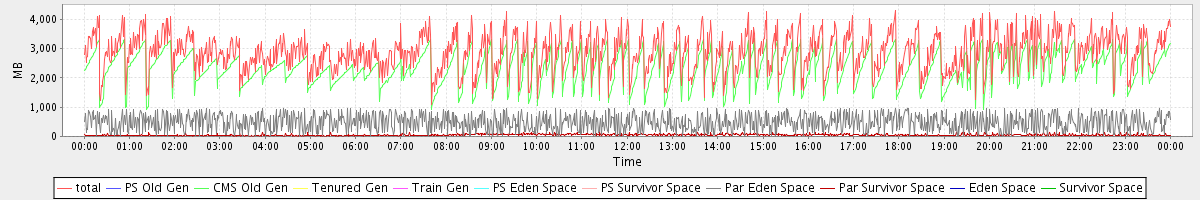 avg(total) = 2890.64 avg(PS Old Gen) = 0.00 avg(CMS Old Gen) = 2357.25 avg(Tenured Gen) = 0.00 avg(Train Gen) = 0.00 avg(PS Eden Space) = 0.00 avg(PS Survivor Space) = 0.00 avg(Par Eden Space) = 485.15 avg(Par Survivor Space) = 48.24 avg(Eden Space) = 0.00 avg(Survivor Space) = 0.00