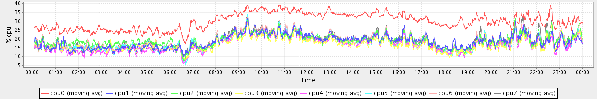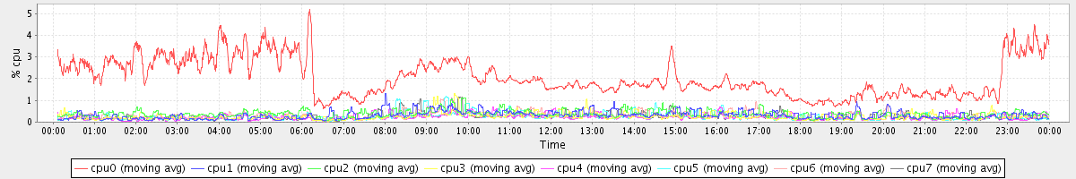 avg(cpu0) = 2.06 avg(cpu1) = 0.32 avg(cpu2) = 0.38 avg(cpu3) = 0.26 avg(cpu4) = 0.22 avg(cpu5) = 0.23 avg(cpu6) = 0.30 avg(cpu7) = 0.23