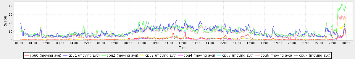 avg(cpu0) = 31.76 avg(cpu1) = 18.08 avg(cpu2) = 17.56 avg(cpu3) = 17.45 avg(cpu4) = 16.06 avg(cpu5) = 17.34 avg(cpu6) = 18.64 avg(cpu7) = 17.74